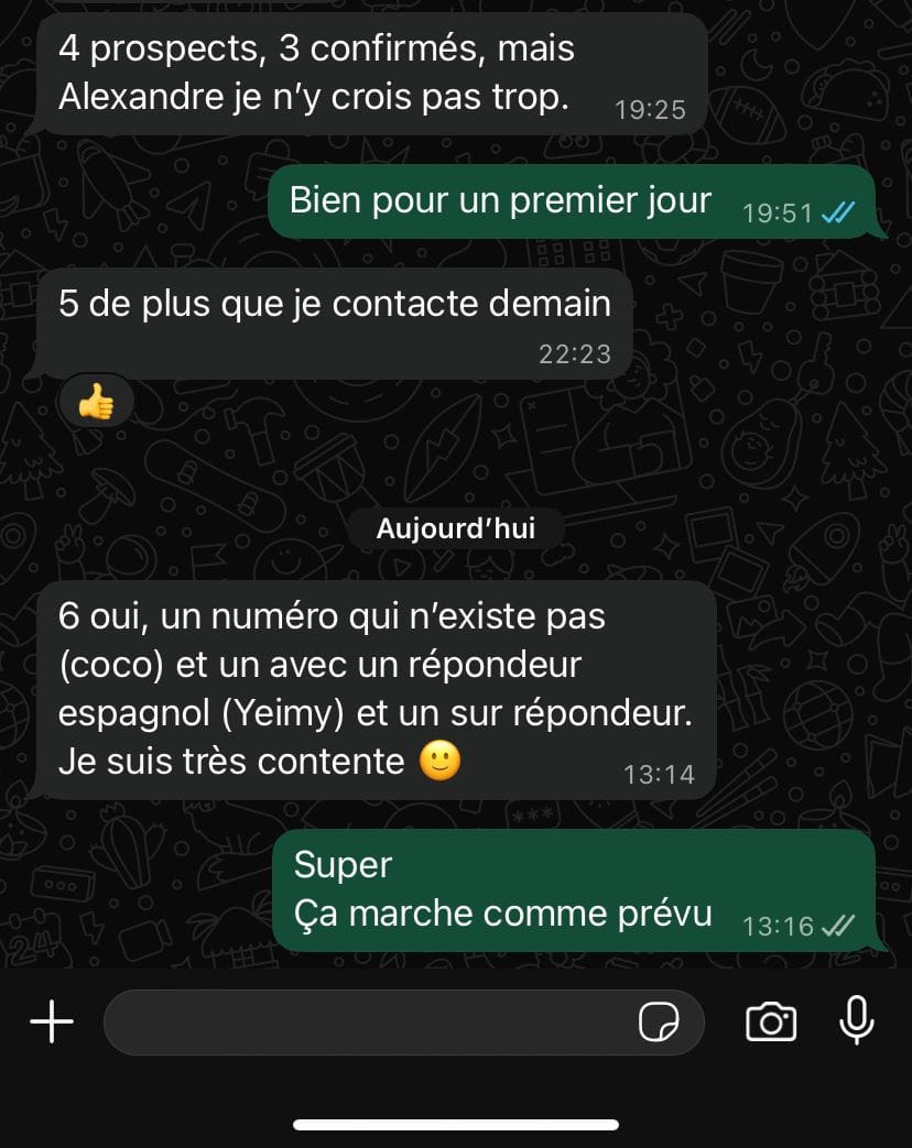 Première semaine :15 rendez-vous.5 150€ encaissés.Puis 4 à 5 RDV par jour en rythme de croisière.